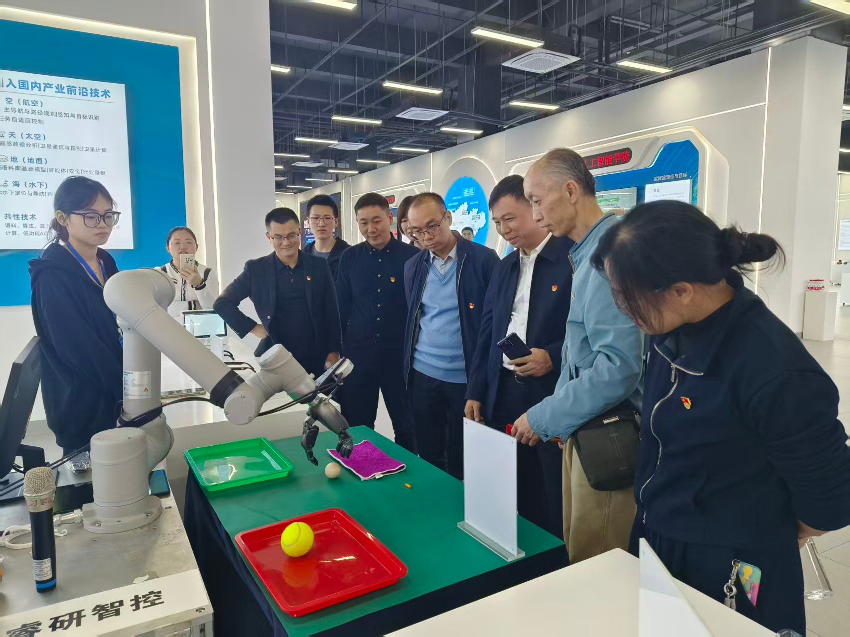 本次活动以“红色引擎+科技赋能”双轮驱动为核心特色,精心设置沉浸式体验与深度研讨环节。在广西人工智能学院展厅,党员们在讲解员的引导下,近距离观摩人工智能前沿技术成果,详细了解AI在教育、科研等领域的创新应用场景,通过实操体验加深了对数字化技术的认知。随后的“AI与教育变革”主题研讨中,党员们结合自身工作实际,围绕“党建+AI”融合路径展开热烈交流,积极探索数字化时代党务工作与学校管理服务提质增效的新思路、新方法。